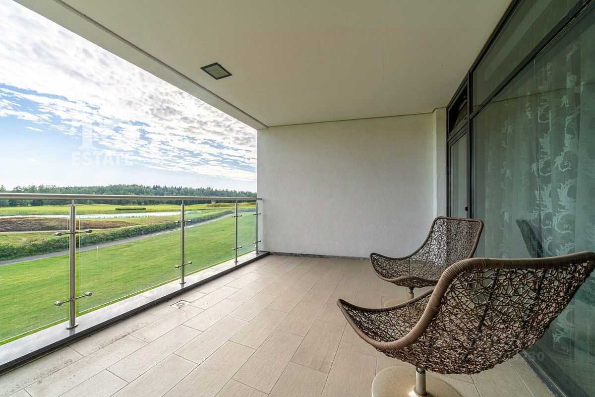 Планировка квартиры включает две отдельные спальни, наполненную светом кухню-гостиную, три ванные комнаты, оборудованные качественной сантехникой и эргономичными решениями для хранения, вместительные гардеробные и открытую террасу с захватывающим видом на гольф-поле. Доступ на террасу предусмотрен из любой комнаты, что усиливает ощущение простора и визуально расширяет жилое пространство благодаря панорамному остеклению.