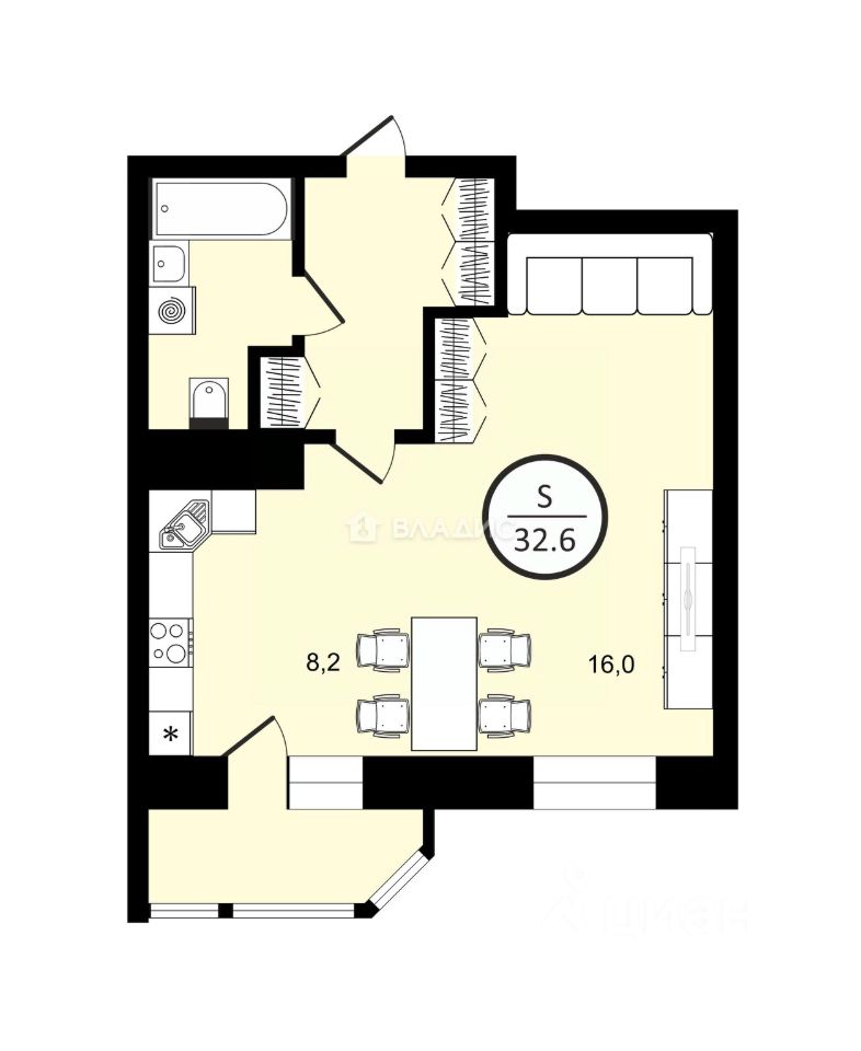 О квартире: + В квартире отличное зонирование пространства, не проходная грязная зона, уединенная спальная ниша, пространства готовки и приема пищи так же зонированы. Предусмотрено место для дивана, что бы создать дополнительное место отдыха. Сохранены пространство и объем.