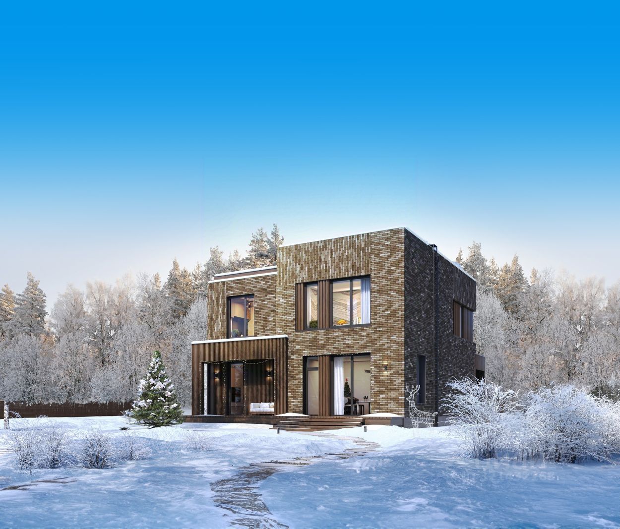 Дом серии Brownie 400 в тёмных благородных тонах отличается простыми формами, а смещение объёмов и сочетание кирпичной кладки с натуральным деревом формирует стильный современный облик дома.