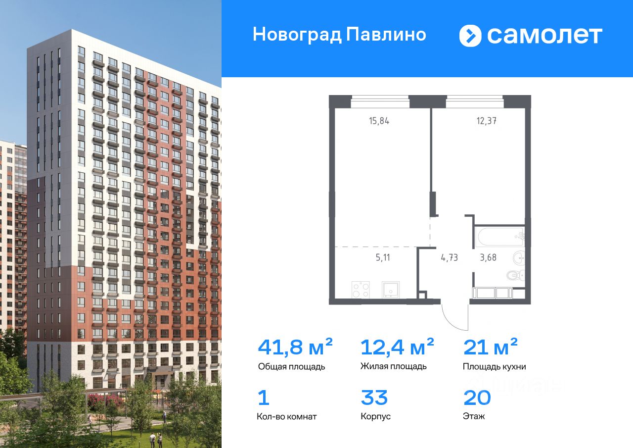 Строим кварталы для жизни с заботой о будущем. Предлагается 1-комнатная квартира комфорт-класса 41,8 кв.м в корпусе 33 на 20 этаже, в ЖК ''Новоград Павлино''