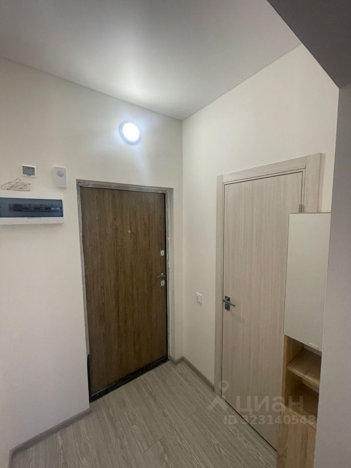 Квартира расположена на 9 этаже 18-этажного дома, что позволяет наслаждаться прекрасным видом на двор. Общая площадь квартиры составляет 23,5 кв. м, кухня занимает 10 кв. м. В квартире есть балкон, на который можно выйти из жилой зоны, и совмещенный санузел. В прихожей есть шкаф. В кухне два подвесных шкафа, стол, стулья, В комнате есть диван, комод и телевизор, проведен интернет. Дом новый, в отличном состоянии, с пассажирским и грузовым лифтами, что удобно для переездов и повседневной жизни. Во дворе дома есть парковочные места, поэтому можно не беспокоиться о месте для вашего автомобиля. Инфраструктура района развита: рядом находятся детские сады, школы, магазины, поликлиника, а также торговые центры.