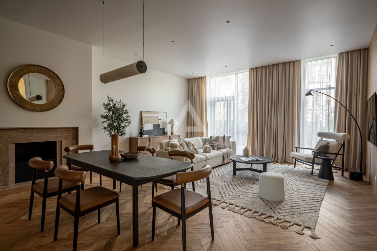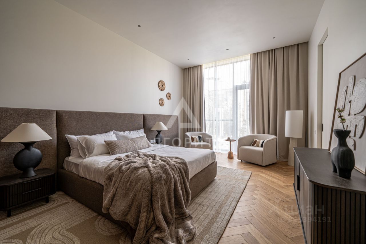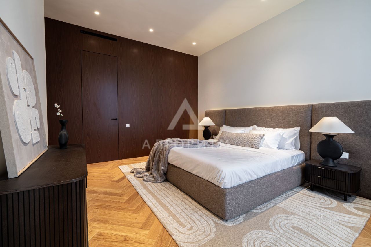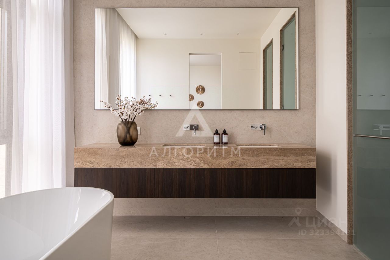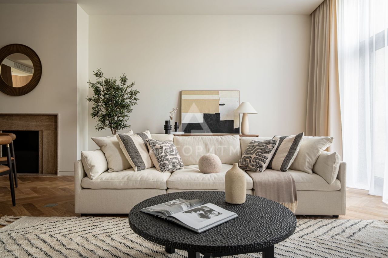 высокие потолки 3,5 метра, панорамные окна в пол, в отделке использованы исключительно натуральные экологичные материалы: натуральный камень - травертин и натуральное дерево - дуб, премиальная бытовая техника ASKO, Elica, Liebherr, Omoikiri канальное кондиционирование во всех комнатах, немецкие смесители Grohe, двери скрытого монтажа Union высотой 2.