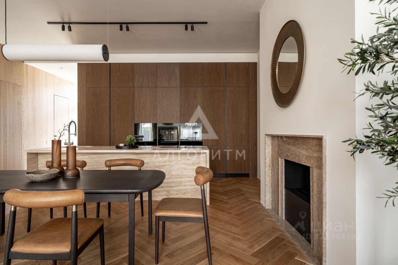 ОТДЕЛОЧНЫЕ МАТЕРИАЛЫ Пол: инженерная доска из дуба Finex. Стеновые панели, встроенные системы хранения: шпон дуба. Столешница кухонного острова: Травертин Classic Все столешницы в санузлах, стеновая панель в мастер-санузле, откосы стеклянных дверей, столешница в постирочной, камин: Травертин Narciss VC Лестница: инженерная доска из дуба Coswick