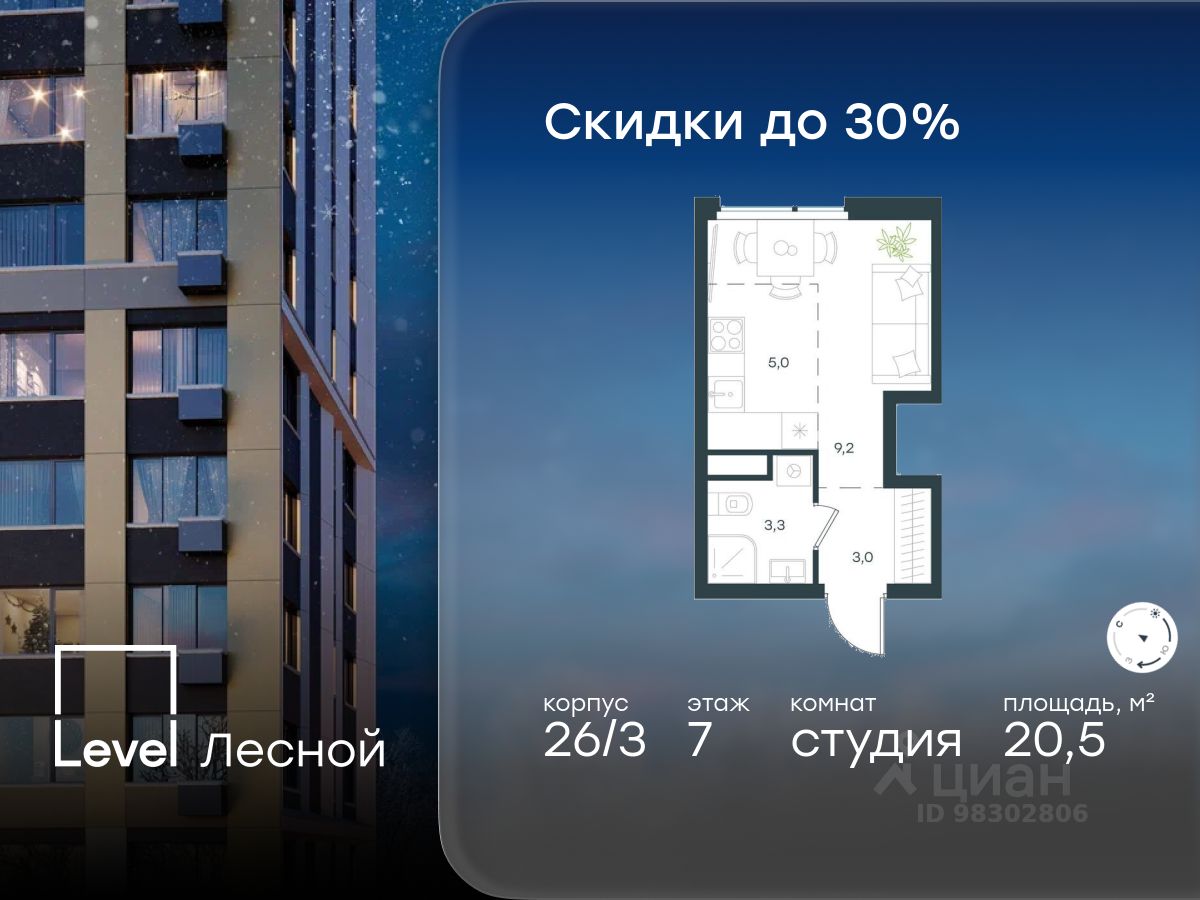 В районе, утопающем в густой зелени лесов, многочисленных парков и скверов, продаётся студия площадью 20.50 кв.м без отделки. Квартира расположена на 7 этаже в жилом комплексе комфорт-класса Level Лесной (компания Level Group/Левел групп).