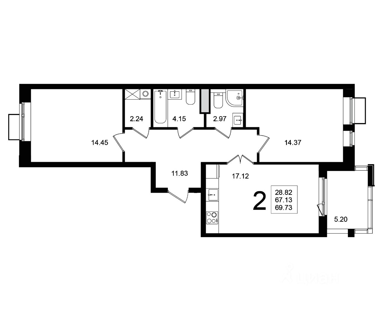 Продаётся 2-комнатная квартира в строящемся доме (Корпус 8), срок сдачи: 4-кв. 2025, общей площадью 69.73 кв.м., на 5 этаже.