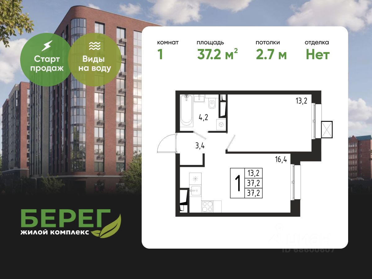 Продаётся 1-комнатная квартира в строящемся доме (Корпус 8 (2 очередь)), общей площадью 37.20 кв.м., на 1 этаже.
