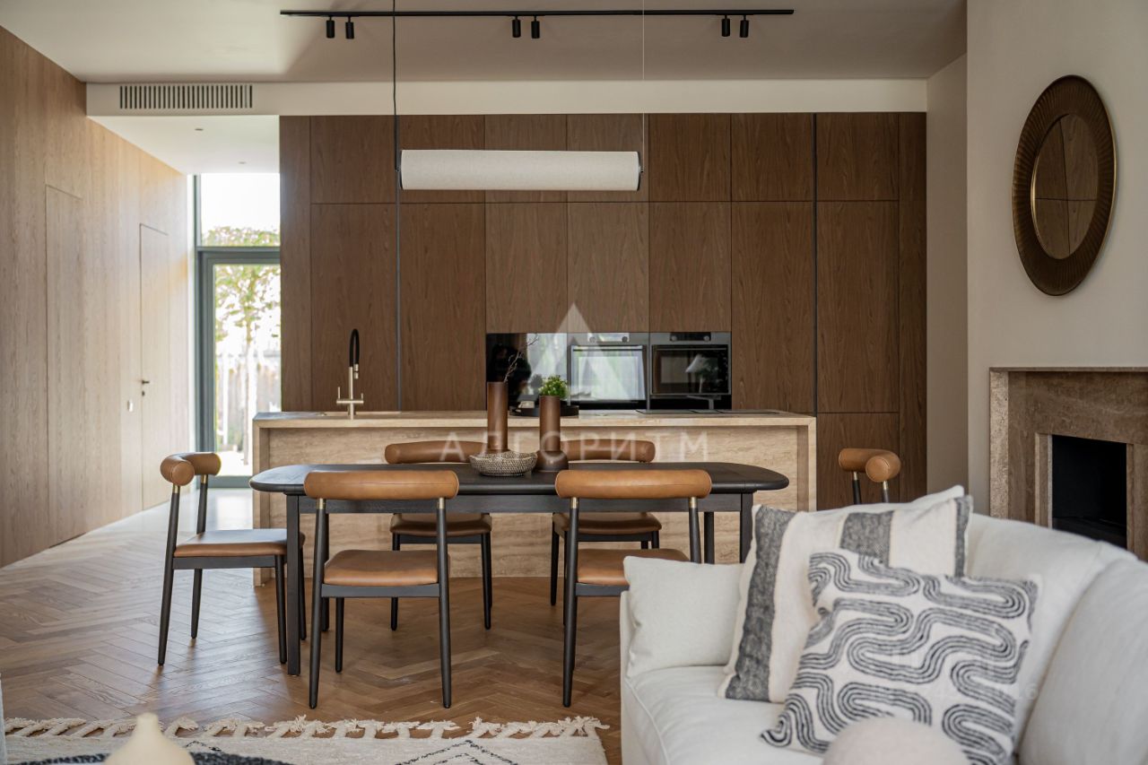 высокие потолки 3,5 метра, панорамные окна в пол, в отделке использованы исключительно натуральные экологичные материалы: натуральный камень - травертин и натуральное дерево - дуб, премиальная бытовая техника ASKO, Elica, Liebherr, Omoikiri канальное кондиционирование во всех комнатах, немецкие смесители Grohe, двери скрытого монтажа Union высотой 2.7 метра, весь технический свет Центрсвет, инженерная доска в укладке елочкой Finex лестница из массива дуба все столярные изделия из натурального шпона дуба.