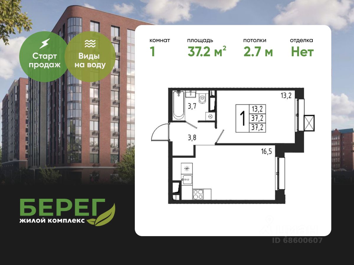 Продаётся 1-комнатная квартира в строящемся доме (Корпус 8 (2 очередь)), общей площадью 37.20 кв.м., на 1 этаже.