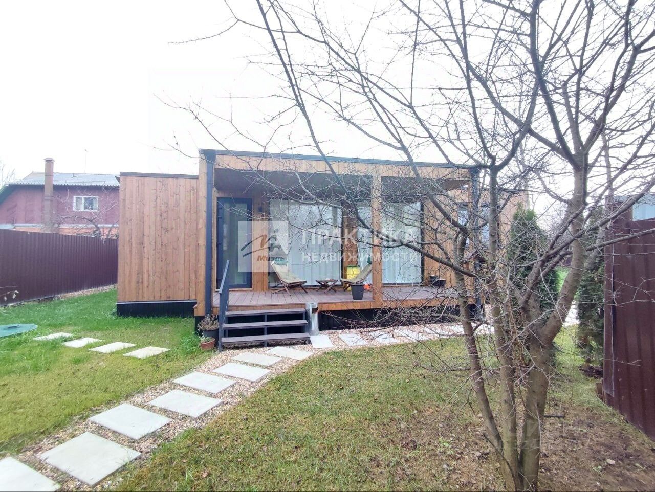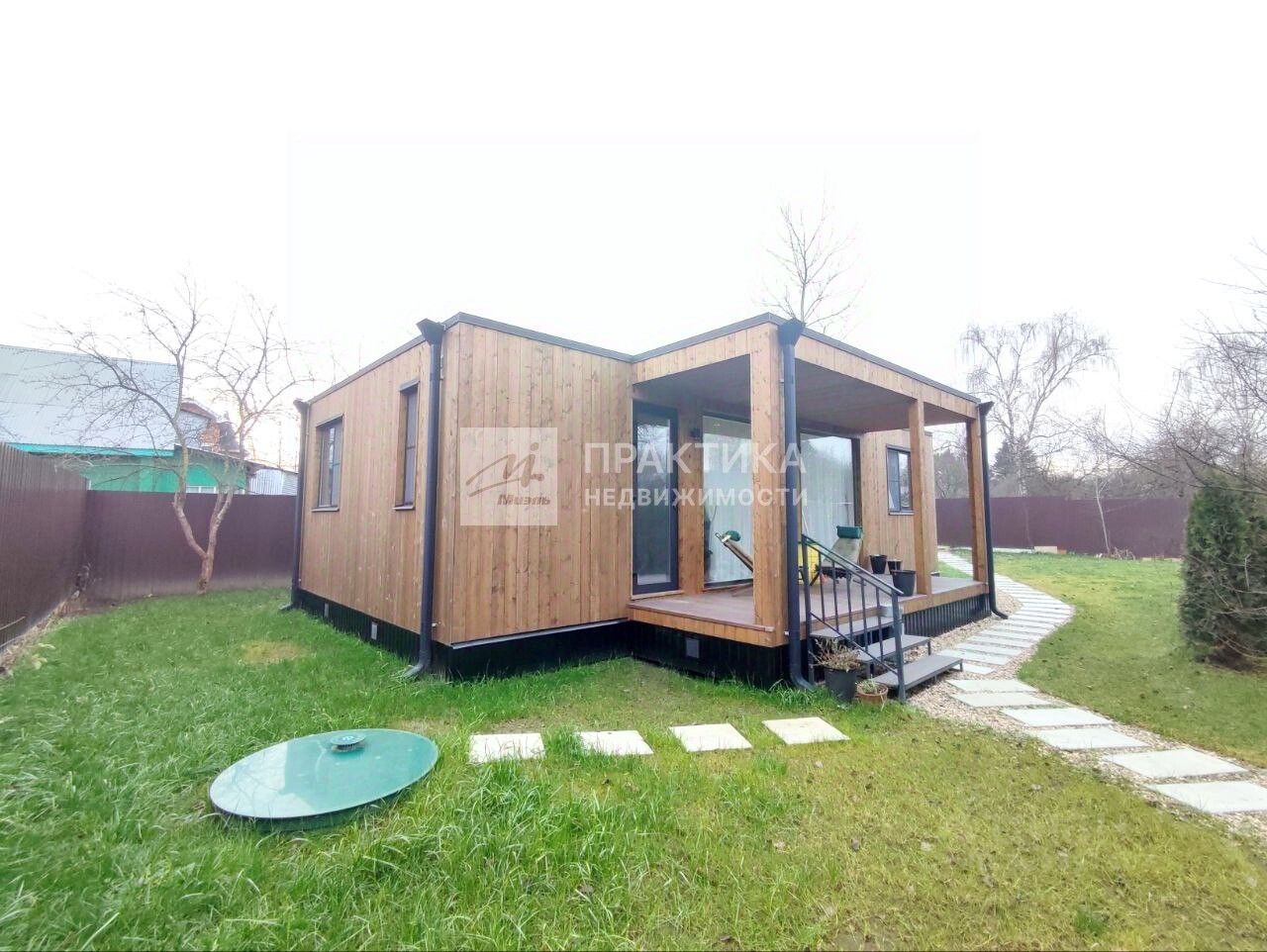 Дом общей площадью 75 м2 без учета террасы, стены каркасные, утепление по стенам - 150, по потолку и полу -200, фундамент - свайный, крыша плоская с хорошей ливневой системой, панорамные окна.