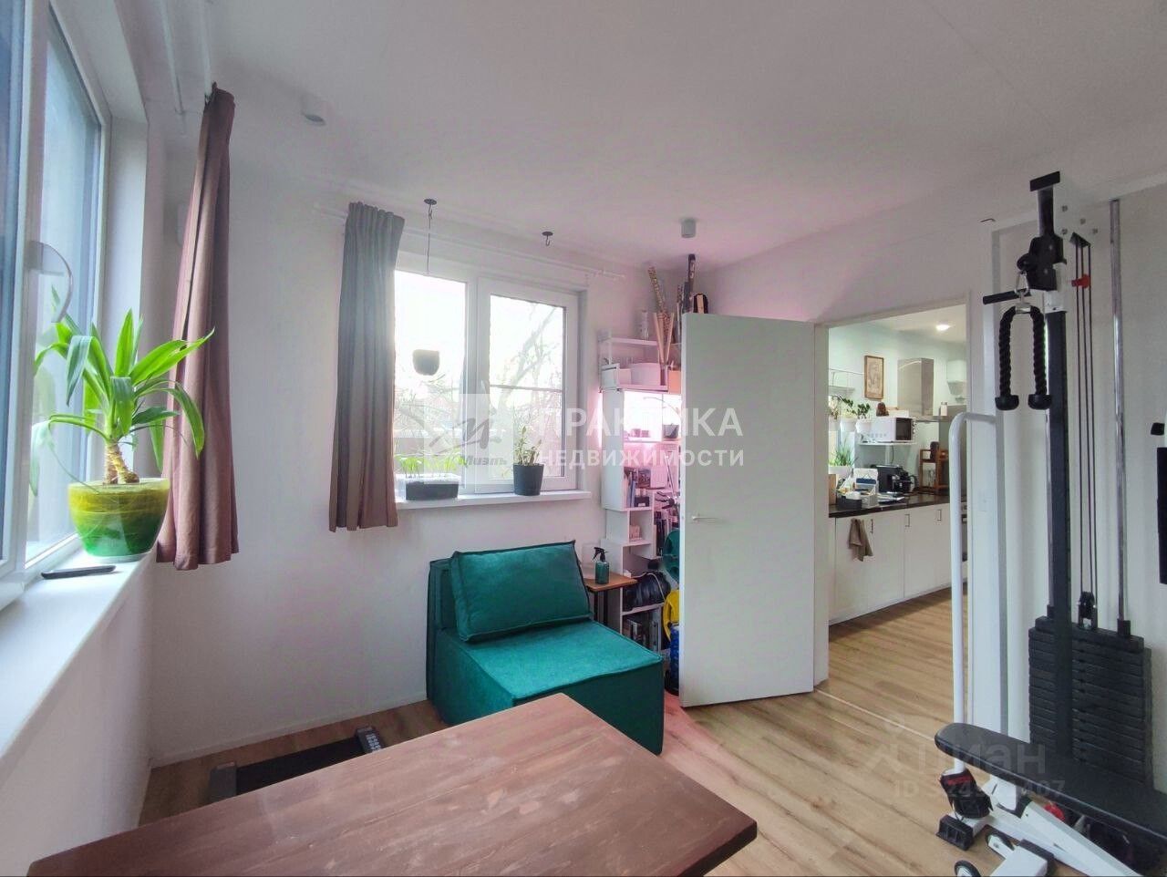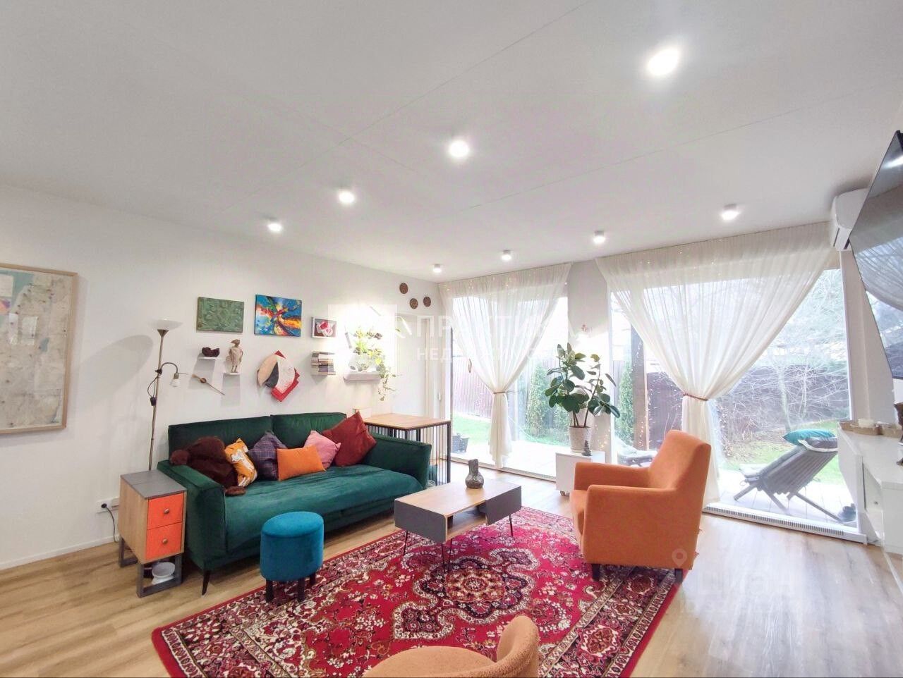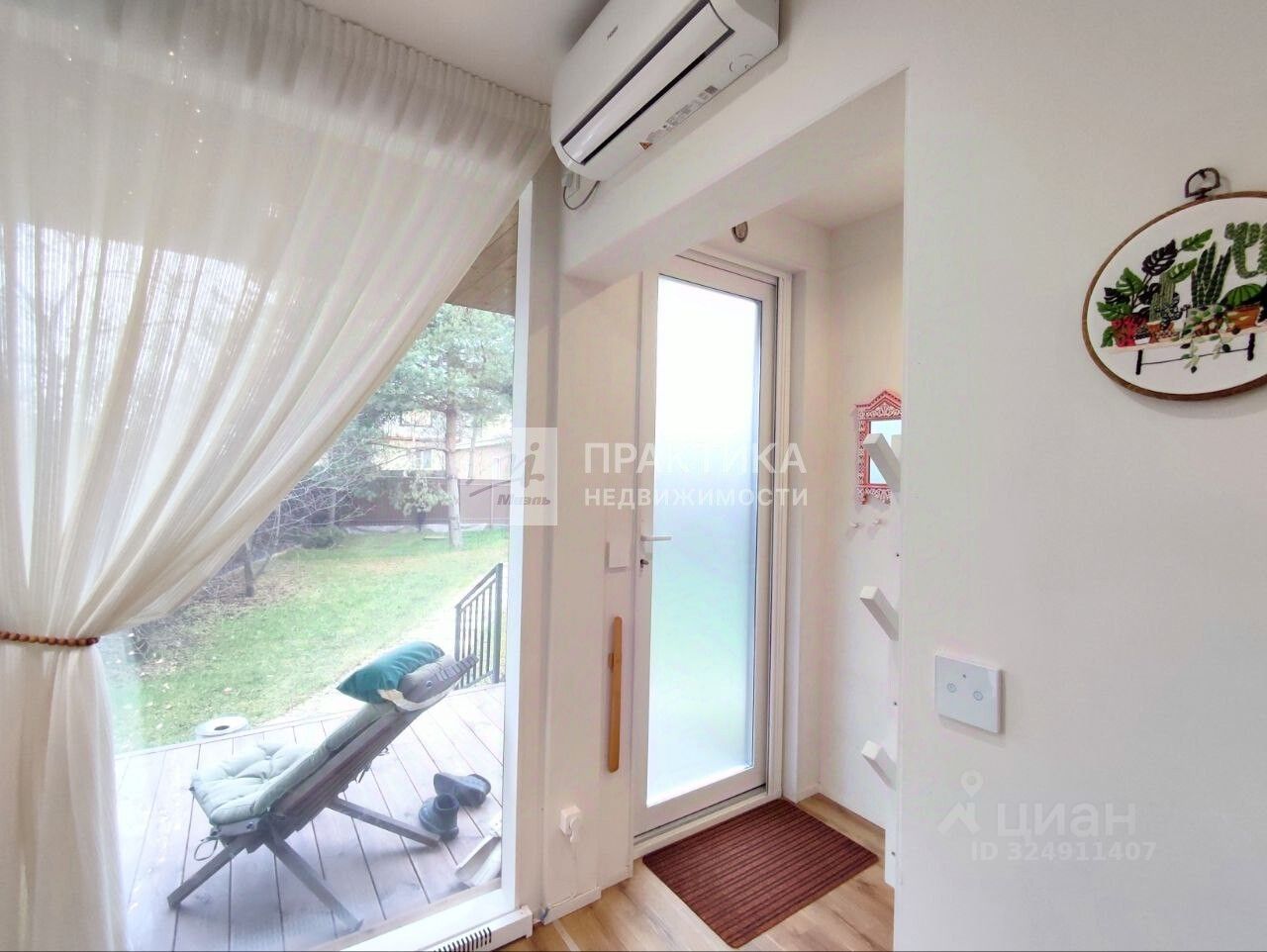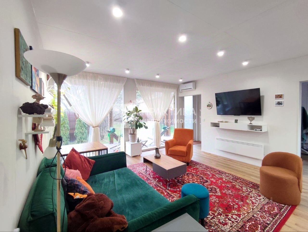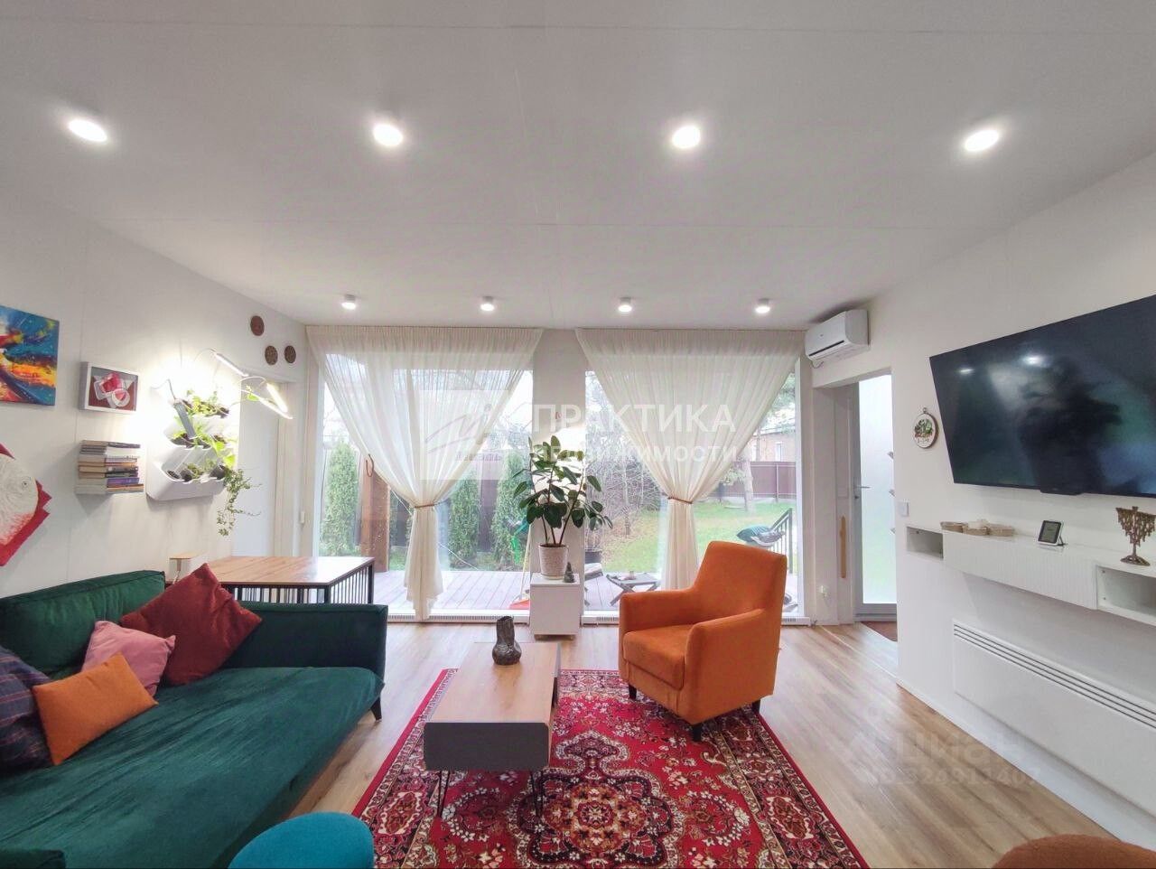 Вход в дом через уютную веранду. Окна в доме пластиковые. Батареи - конвекторы встроенные в пол возле панорамных окон и дополнительно подвесные. Внутренняя отделка стен под покраску. Потолок - гипсокартон с точечным освещением. В спальне большая гардеробная с встроенной, потайной, гладильной доской. Мебель и техника остается по договоренности.
