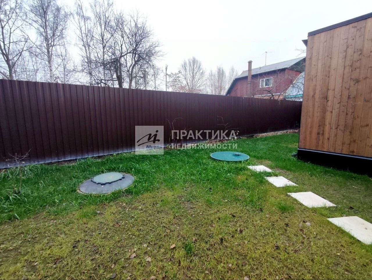 На участке: - бытовка, - септик, - скважина, - летом - шезлонги и мангал, - яблоня, алыча и несколько дикорастущих деревьев.