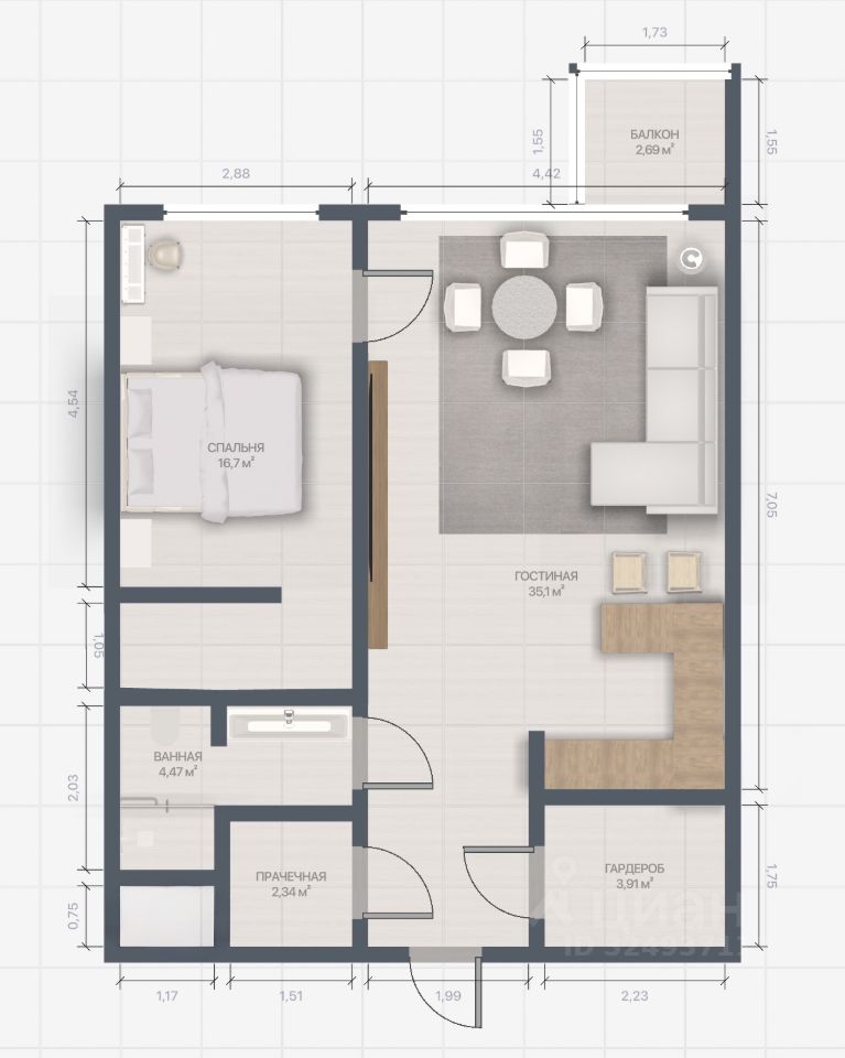 -Светлая гостиная. -Прихожая с гардеробом. -Ванная комната. -Постирочная комната. -Спальня с гардеробом. -Уютный балкон.