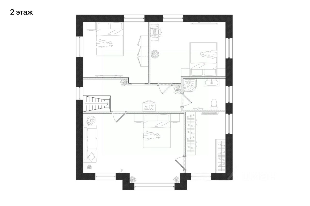 Планировка дома 2 1 этаж: прихожая, кухня-гостиная-столовая, санузел, кабинет/гостевая спальня, 2 этаж: мастер-спальня со своей ванной комнатой, две спальни, санузел.