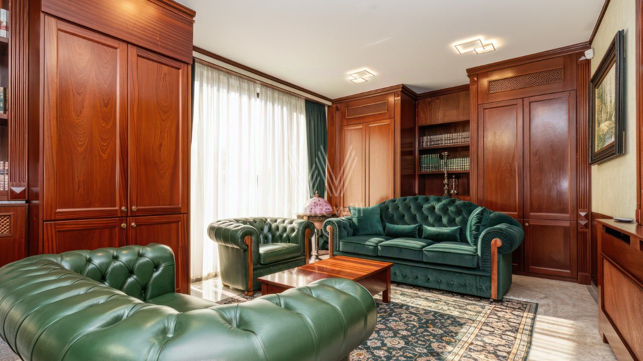 Двухэтажный особняк в Деревне Барвиха. Современное здание выполнено в стиле современного классицизма с элементами неоклассики. Темно-синий фасад украшен белыми колоннами коринфского ордера, которые поддерживают треугольный фронтон. Внутри смешанная планировка, выполнен качественный ремонт. Проведены центральные коммуникации, приточно-вытяжная вентиляция и сплит-системы. Для удобства передвижения установлен лифт, За безопасность отвечают система пожаротушения и видеонаблюдения. На прилегающей территории организована наземная парковка на 10 машин. Особняк подходит для размещения ресторана или шоурума.