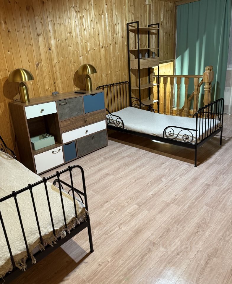 Гостиная с кухней, два удобных дивана , камин и Wi-Fi. Кухня со всей необходимой посудой, микроволновка, холодильник, посудомойка. Гостевая спальня с 2 диванами на первом этаже. Второй этаж: спальня с двухспальной кроватью, спальня с двумя детскими кроватями. Парковка (на территории) на три машины. В 5 минутах езды супермаркет, аптека. До ближайшего ТЦ 15 мин.