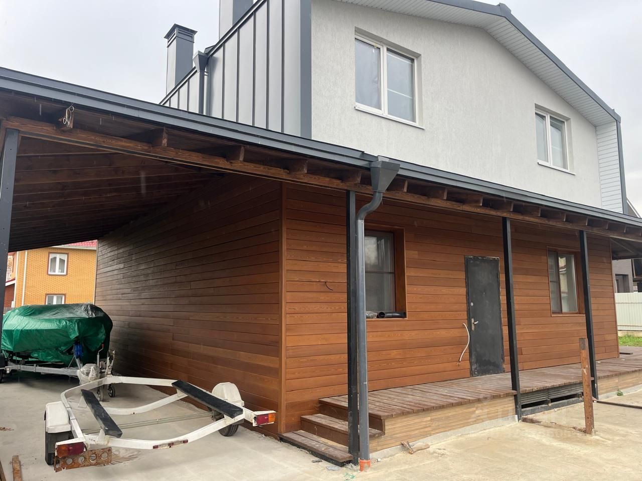 Продается просторный, капитальный дом для круглогодичного проживания на участке 8 соток, общей площадью 171,3 кв. м. под чистовую отделку. Участок находится в закрытом, обжитом КП Новожилино. С левой стороны к дому - навес на 2 машины площадью 45 м2, с правой стороны дома веранда площадью 45 м2 с возможностью дальнейшего остекления. Конструкция дома ( фундамент монолитный ЖБ свайно-ростверковый, накрытый монолитной ЖБ плитой, стены газосиликатные блоки 300мм, с наружи утепление 100мм, вентилируемый и теплый фасад, перекрытие сборные ЖБ плиты на монолитном поясе, кровля фальцевая (металл с покрытием 0,5мм RAL 7024 , двойной фалец с организованным стоком воды), утепление 200мм, с продухами и вентилируемым коньком). . Участок ровный, правильной формы, огорожен забором. Въезд на участок осуществляется через откатные ворота с приводом, открывание с пульта. Также на участок можно войти через калитку, отдельно стоящую. Площадка перед домом и под навесом, а также отмостка, выполнена в бетоне. Полы веранды зашиты палубной доской из лиственницы. Фасады дома 1 этажа утеплены и отдекорированы планкеном из лиственницы класс экстра. Остальные фасады выполнены по технологии теплый фасад, с нанесением фактурной штукатурки. Установлены качественные пластиковые окна РЕХАУ с двойными стеклопакетами. На участке пробурена скважина 50 м., установлен септик ТОПАЗ, выкопан дренажный колодец 12 колец. Электричество 3 фазы 15 кВт, канализация, закладная под воду, заведены в дом. Есть дополнительные закладные под ввод интернета, уличного освещения и тд. Под вентилируемыми фасадами и на веранде, выполнена подготовка под монтаж освещения. В доме установлен электрический щит с автоматикой от перенапряжения, по всем помещениям разведено освещение, розеточные группы, выполнена подготовка под установку кондиционеров. Установлен электрический котел, собрана полностью котельная, произведена разводка теплых полов, подготовка под установку радиаторов отопления. Также произведена разводка по помещения воды (ХВС и ГВС) и канализации. В доме выполнена бетонная стяжка, под чистовую отделку. Зимой в доме очень тепло, среднее потребление электричества в зимний период порядка 4-5 тыс. рублей. На данный период времени по улице вдоль участка прокладывают ГАЗ. Планировка дома: 1 этаж (котельная, постирочная, с/у, гостевой санузел, кухня-столовая, гостиная, гостевая спальня), 2 этаж (3 спальни, кабинет, 2 санузла). Удобное транспортное сообщение с Москвой и Московской область, 5 мин. пос. Менделеево, 10 мин. г. Зеленоград, со всей развитой инфраструктурой и социальными объектами. Дом и земельный участок в собственности. Все документы оформлены согласно законодательству. Один взрослый собственник, в доме никто не зарегистрирован, подходит под ипотеку. Оперативный показ! Разумный торг, приветствуется!!!