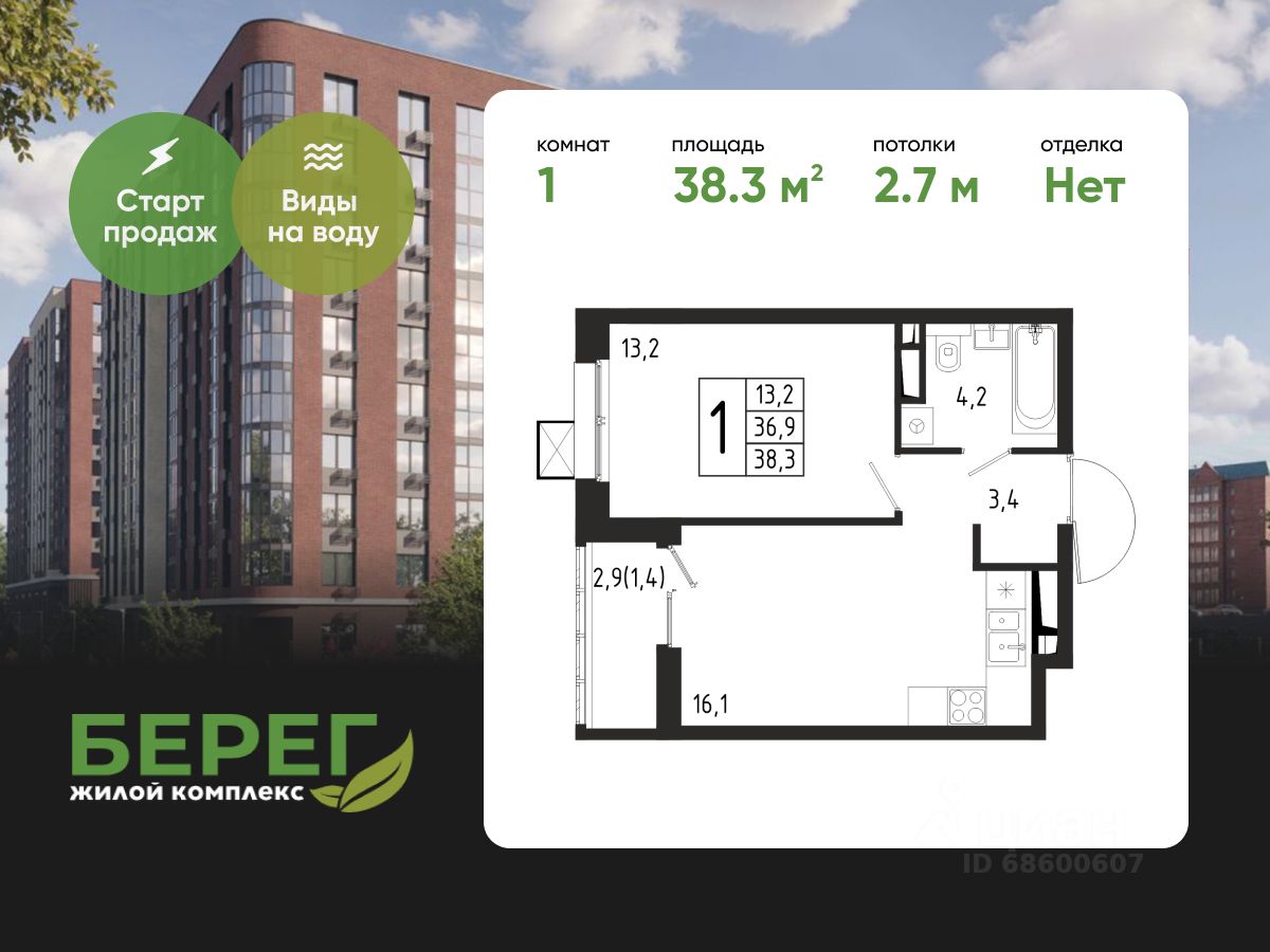 Продаётся 1-комнатная квартира в строящемся доме (Корпус 4 (2 очередь)), общей площадью 38.30 кв.м., на 2 этаже.