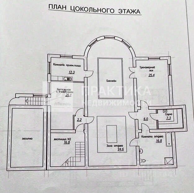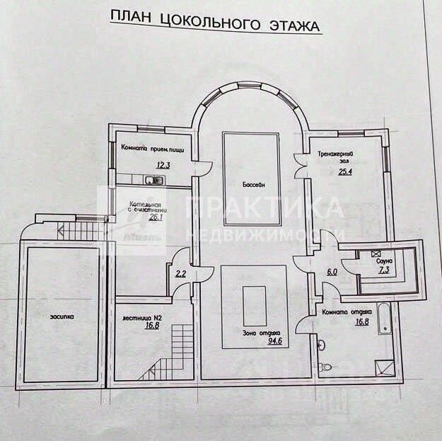 Поэтажный план: Цоколь - Бассейн и зона отдыха 94,6 кв.м., тренажерный зал 25,4 кв.м., бар 12,3 кв.м., с.у. ванная, душ 16,8 кв.м.