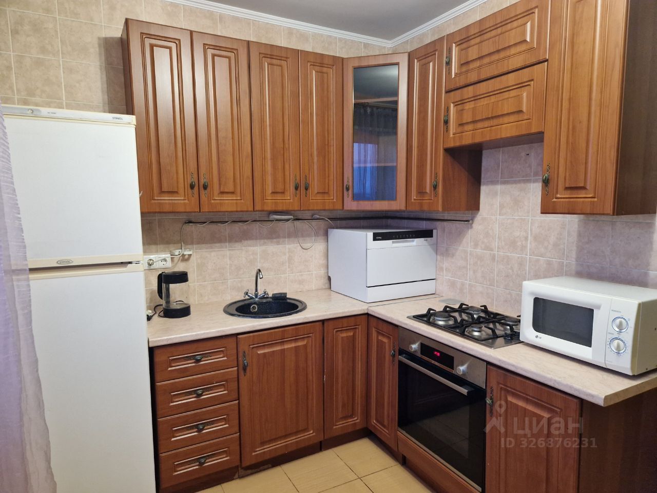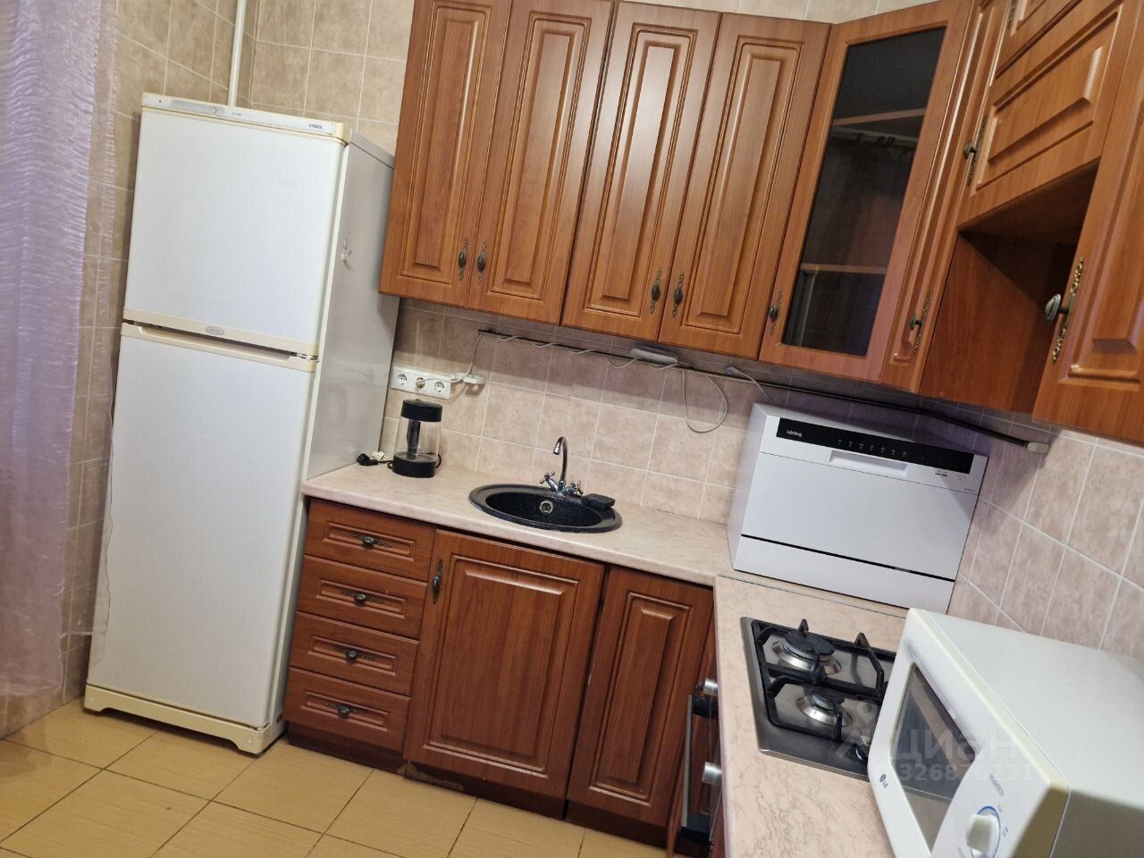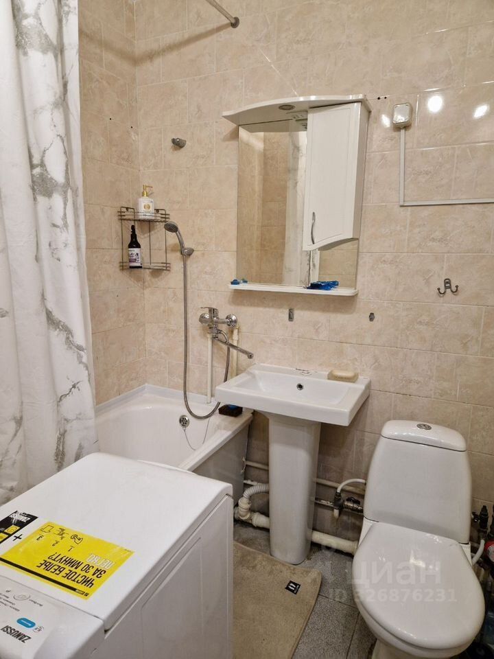 Kухня оснащена всем необходимым: холодильник, газовая плита, микроволновая печь и стиральная машина. Санузел раздельный, оформлен в светлых тонах.