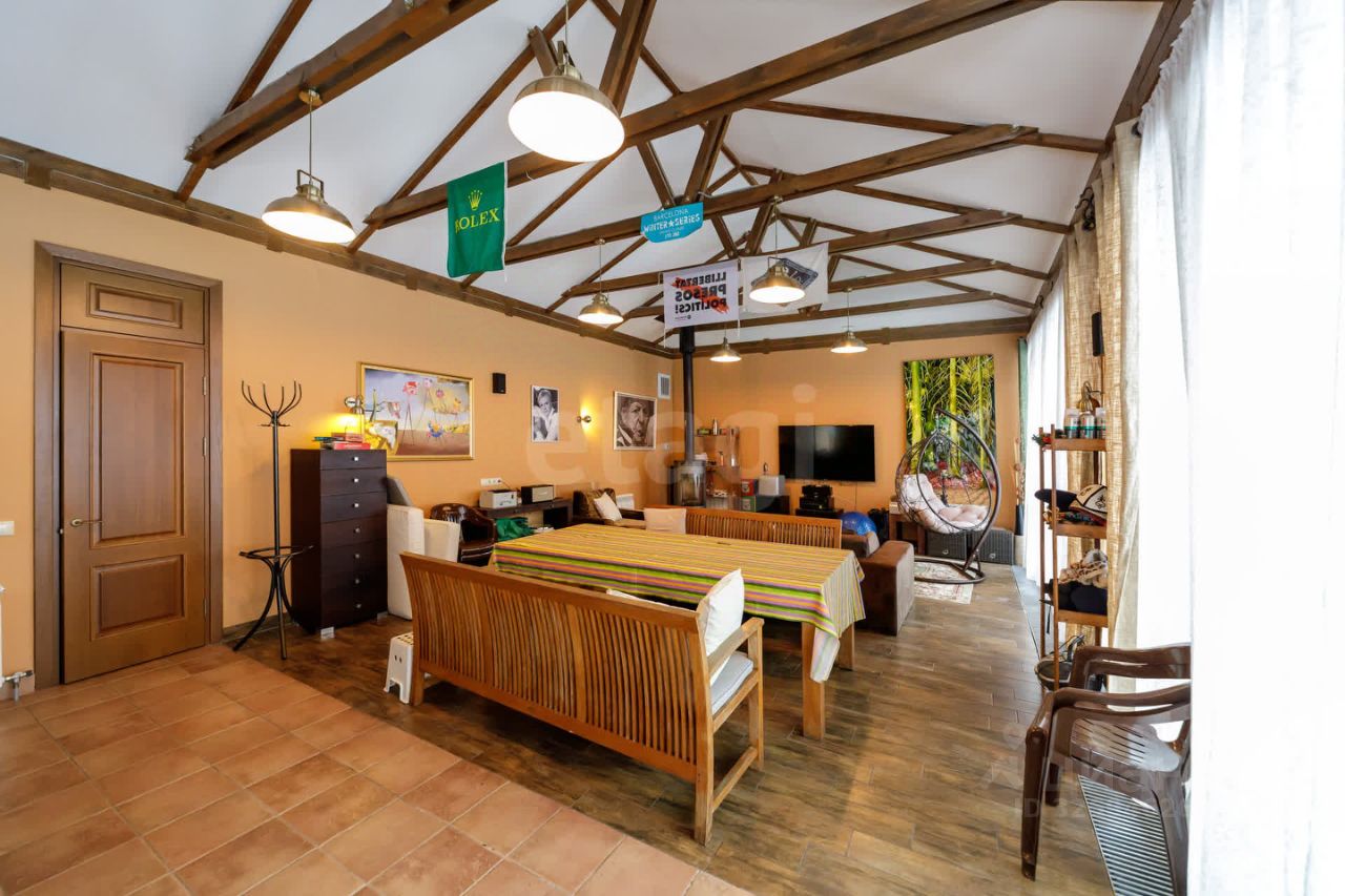 Просторный застекленный садовый дом с большой зоной для отдыха и панорамным видом оснащён каменным мангалом и дровяной печью, также станет идеальным местом для уютного времяпровождения.